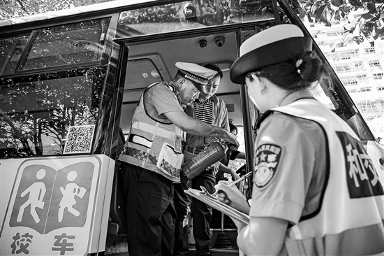 7月22日,安徽省和縣公安局交警大隊組織民、輔警對轄區開展暑期托班的幼兒園校車安全檢查。檢查中,民警認真查看校車年檢以及維護保養等情況,并逐車認真查看了逃生錘、滅火器等安全設備有效情況,保障學生乘車安全。本報通訊員 王徹 攝