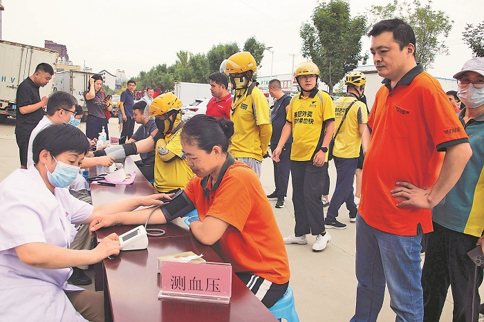7月25日,山東省梁山縣中醫院醫生為快遞員測量血壓、血糖、心率,講解日常健康保健、職業傷害預防等知識。
