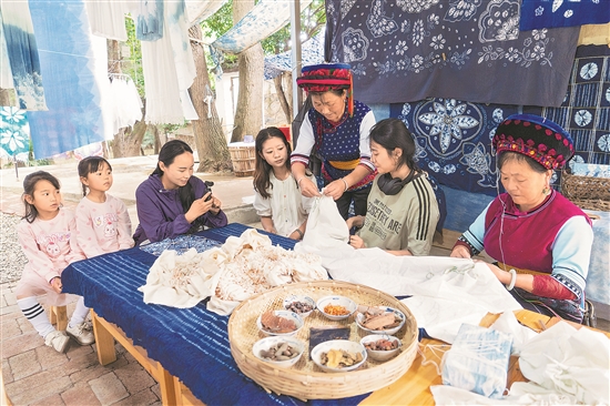 7月24日,來自新疆的游客在蝴蝶泉景區體驗非遺項目“白族扎染”。