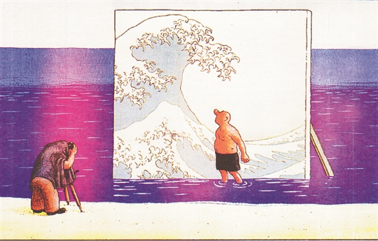 海邊豎起波浪濤天的景版,“勇敢者”佇立期間,擺出“勝似閑庭信步”的架勢……經過特寫和加工創作出“駕馭潮流”的好漢大作。