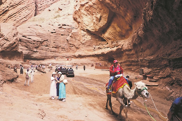 圖為近期游客在新疆維吾爾自治區(qū)庫車市天山神秘大峽谷觀光游覽。