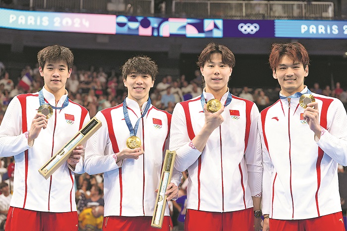 徐嘉余、覃海洋、孫佳俊、潘展樂(從右至左)在頒獎儀式上。新華社記者 杜宇 攝