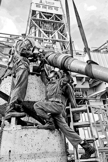 工人正在進行鉆井作業。本報記者 陳丹丹 攝