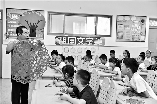 為解決雙職工家庭學生和農村留守兒童暑假期間“看護難”問題,共青團濟寧市任城區委自2016年以來開展“七彩暑托班”愛心志愿活動,為孩子們開展傳統文化、身心健康等活動,給孩子們一個多彩、快樂、安全的假期生活。圖為在山東省濟寧市任城區觀音閣街道琵琶山社區“七彩暑托班”,非遺傳承人張躍廣向孩子們介紹剪紙作品。新華社記者 郭緒雷 攝