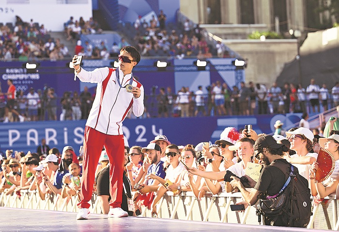 8月5日,跳水男子雙人3米板金牌得主、中國選手龍道一在冠軍公園與觀眾互動。新華社記者 賀燦鈴 攝
