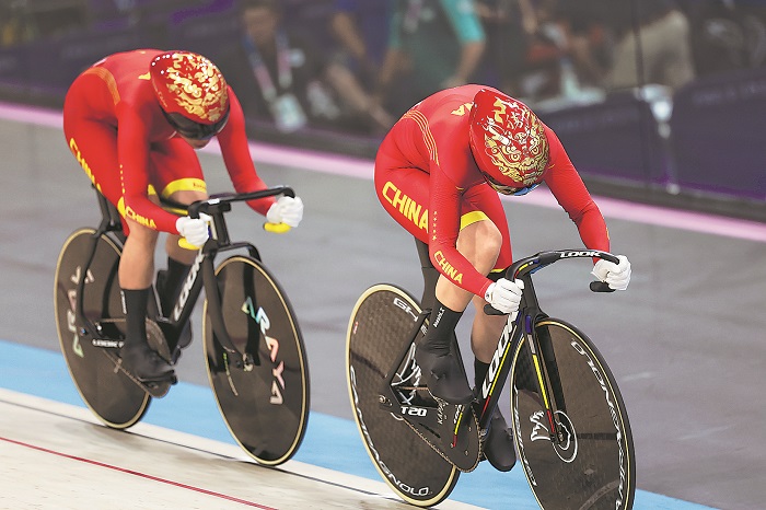 北京時間8月6日凌晨,在巴黎奧運會場地自行車爭先賽中,中國隊獲得女子團體第六名。圖為中國選手在女子團體爭先賽首輪比賽中。