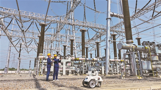 8月9日,在安徽省滁州市南譙區,電力工人在500千伏同樂變電站進行智能巡視檢查。