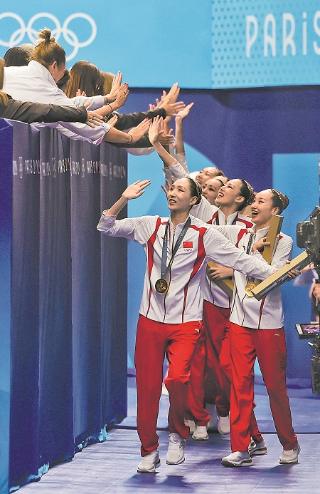 8月8日,中國隊獲得花樣游泳團體賽冠軍。這是中國花樣游泳隊首次在奧運賽場上奪得金牌。賽后隊員們與場邊觀眾互動。