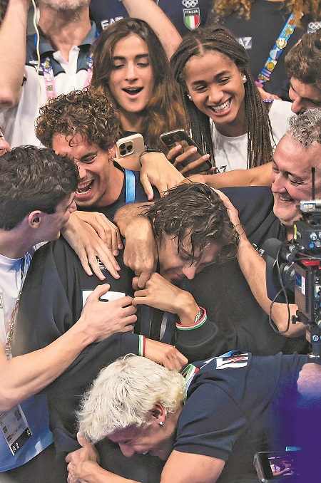 7月30日,意大利名將切孔獲得男子100米仰泳冠軍后被拉拉隊包圍慶祝。