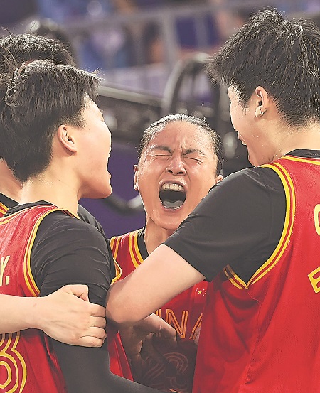 7月31日,在三人籃球女子分組循環(huán)賽中,中國隊戰(zhàn)勝法國隊后高興地擁抱在一起。