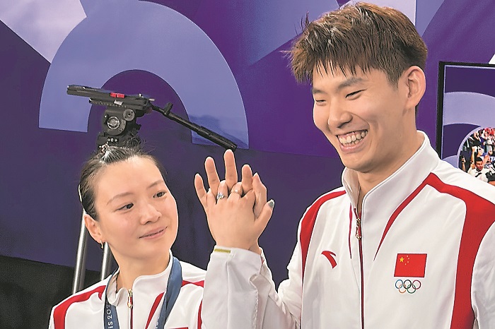 8月2日,中國選手黃雅瓊(左)和搭檔獲得羽毛球混雙金牌。領取獎牌后,黃雅瓊在現場被中國男子羽毛球運動員劉雨辰(右)求婚。圖為二人現場向記者展示求婚戒指。