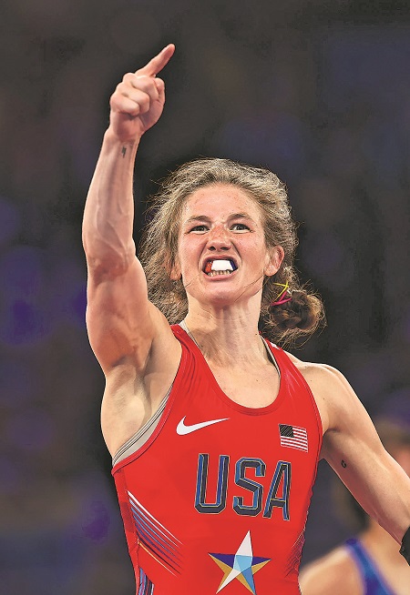 8月7日,摔跤女子自由式50公斤級半決賽,美國選手莎拉·安戰(zhàn)勝對手后慶祝勝利。
