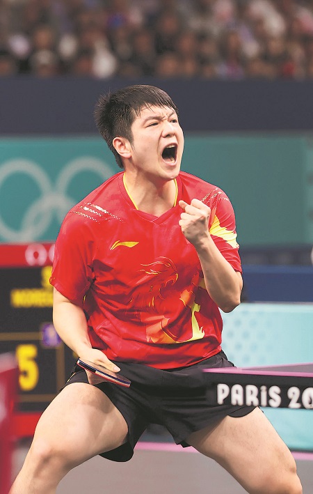 8月4日,中國選手樊振東在乒乓球男單決賽中慶祝得分。