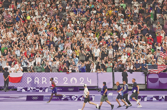 8月5日,美國選手萊爾斯奪得田徑男子100米冠軍后繞場慶祝。