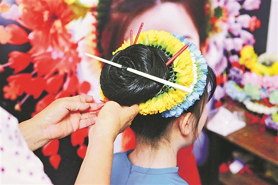 8月8日,福建省泉州市蟳埔村村民為游客簪花。