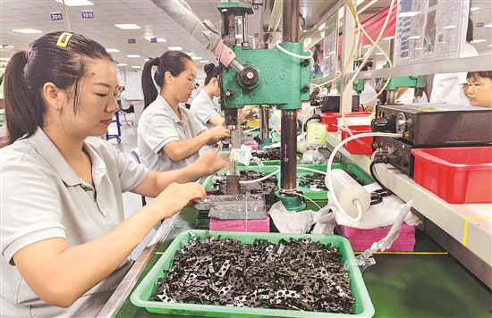 近日,位于重慶萬盛經(jīng)開區(qū)南桐鎮(zhèn)平山工業(yè)園區(qū)某生產(chǎn)車間,“媽媽?shí)彙眴T工在生產(chǎn)線上進(jìn)行組裝作業(yè)。近年來,萬盛經(jīng)開區(qū)總工會(huì)推動(dòng)民營(yíng)企業(yè)做好建會(huì)入會(huì)工作,指導(dǎo)企業(yè)建立靈活用工機(jī)制,針對(duì)鄉(xiāng)村留守婦女專門開設(shè)“媽媽?shí)彙?,既方便她們照顧家庭又促進(jìn)就業(yè)。本報(bào)通訊員 曹永龍 攝
