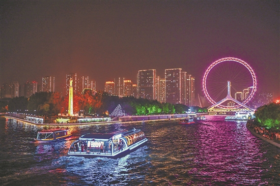 8月10日,游客乘坐海河游船游覽天津夜景。