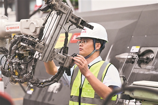 袁冬華正在對智能機械手臂進行日常檢查和維護。吳宇 攝