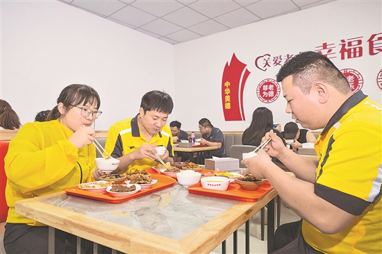 近日,安徽省合肥市廬陽區海棠街道舉辦“凝心聚力,同心向黨”暖“新”主題黨建活動。海棠街道黨工委、總工會向轄區快遞員、外賣配送員發放社區食堂就餐券、眼檢查健康卡、理發卡、健身卡等愛心大禮包。圖為當日,在海棠街道海棠花園小區社區食堂內,快遞員、外賣配送員正在就餐。本報通訊員 趙明 攝