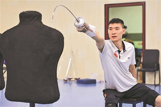 8月12日,中國輪椅擊劍集訓(xùn)隊(duì)(江蘇組)運(yùn)動員仲賽春在訓(xùn)練中。新華社發(fā)(蘇陽 攝)