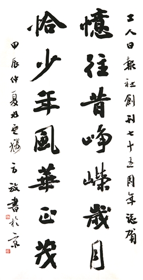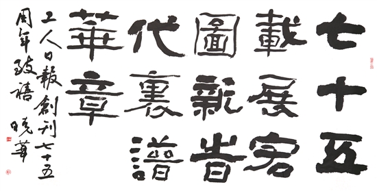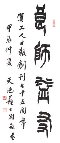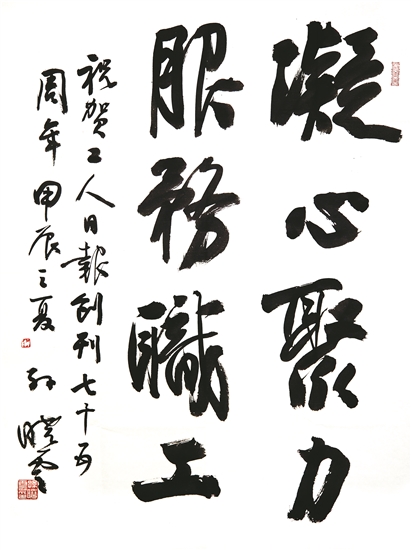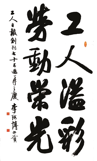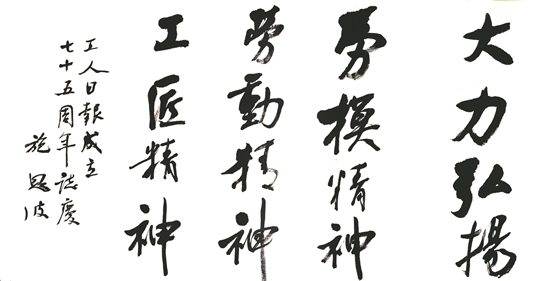 書法家小分隊由中國職工文化體育協會會長李守鎮帶隊,帶來了中國書法家協會名譽主席張海、蘇士澍和中國書法家協會主席孫曉云等書法名家專門為工人日報社書寫的書法作品。活動現場氣氛熱烈,職工們手捧宣紙排起長隊。中國職工書法家協會主席鄭曉華與副主席李純博、施恩波、于恩東,以及中國職工美術家協會主席楊中良等為職工們揮毫潑墨,翰墨抒情,也為工人日報社送上充滿墨香的生日祝福。現選取部分書法作品進行展示,以饗讀者。