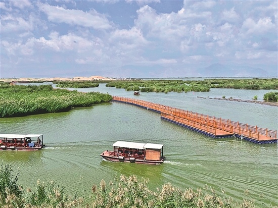 8月9日,在寧夏沙湖景區,南來北往的游客乘船行進于隨風搖曳的萬畝蘆葦。