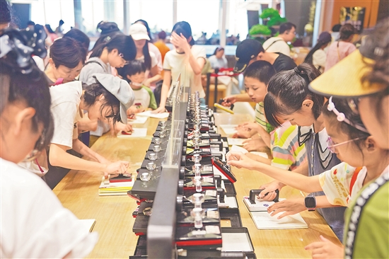 圖為游客在湖南博物院博物館公園體驗文創(chuàng)產(chǎn)品。新華社記者 薛宇舸 攝