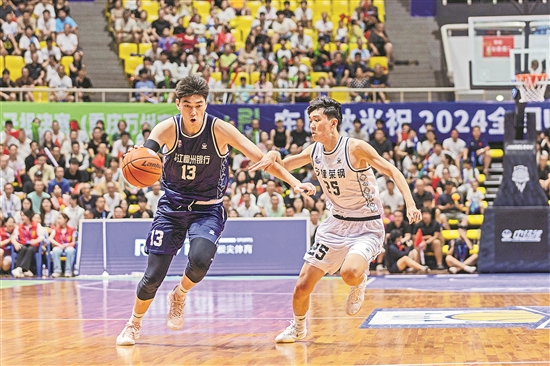 浙江稠州銀行隊(duì)球員張洪碩(左)在比賽中帶球突破。新華社記者 黃偉 攝