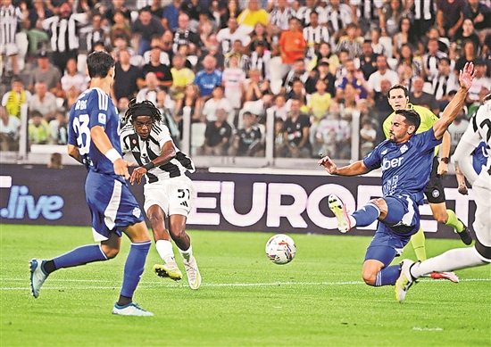 北京時間8月20日,在2024-2025賽季意大利足球甲級聯賽第1輪比賽中,尤文圖斯隊主場3比0戰勝科莫隊。圖為尤文圖斯隊球員姆班古拉(中)在比賽中射門得分。新華社發(阿爾貝托·林格利亞 攝)