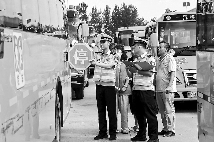 8月20日,安徽省淮北市公安局交警支隊四大隊民警對轄區一家校車服務有限公司的校車進行安全檢查,保障學生乘車安全。本報通訊員 萬善朝 攝