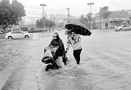 8月19日,山東省滕州市突降大雨,城區(qū)道路積水嚴(yán)重,滕州市公安局交警大隊組織警力走上路面,做好暴雨天氣道路交通疏導(dǎo)管控和群眾救助工作。