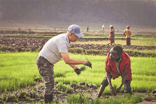 近日,在盧旺達南方省胡耶區,水稻專家鄭瑞金(左)在稻田里指導當地稻農進行秧苗移栽。