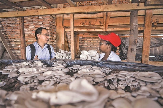 近日,在盧旺達首都基加利的一家食用菌培育作坊,菌草專家陳曉斌(左)向作坊主人蘇珊娜·尼庫澤提供指導。陳曉斌在示范中心工作近6年,他指導當地農民從事菌草培育,見證了很多從事食用菌培育的當地農戶生活變得越來越好。