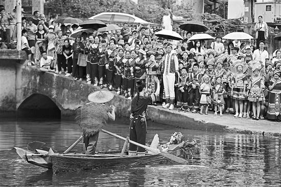 8月18日,在廣西壯族自治區(qū)柳州市融水苗族自治縣汪洞鄉(xiāng),村民們在改造后的河道上進行“劉三姐河上實景演出”,展示當地推進民族文化旅游產業(yè)發(fā)展、助力鄉(xiāng)村振興的成果。