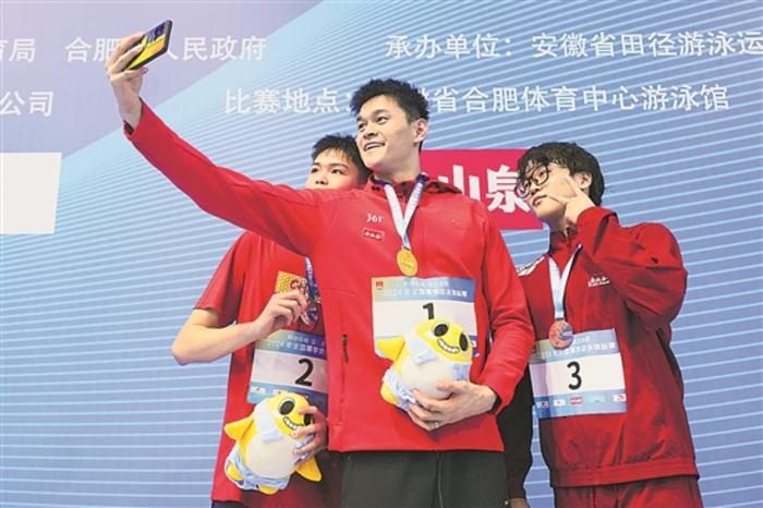 8月25日,冠軍孫楊(中)、亞軍徐海博(左)和季軍徐一舟在頒獎(jiǎng)儀式上合影。當(dāng)日,在安徽合肥舉行的2024年全國(guó)夏季游泳錦標(biāo)賽男子400米自由泳決賽中,浙江壽仙谷隊(duì)選手孫楊以3分49秒58的成績(jī)獲得冠軍。新華社記者 杜宇 攝