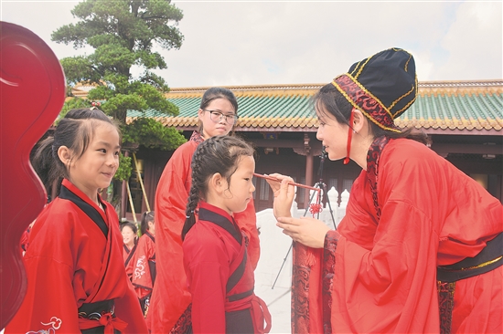 朱砂點痣、誦讀經(jīng)典……日前,近200名職工子女在福建省龍巖市武平縣總工會組織的暑托班里參加國學(xué)夏令營,體驗“國學(xué)之禮”。
