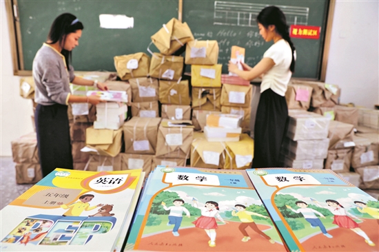 8月29日,河南省焦作市溫縣第三實驗小學教師在整理、分發新學期教材。開學在即,各地做好各項準備工作,迎接新學期。 新華社發(徐宏星 攝)