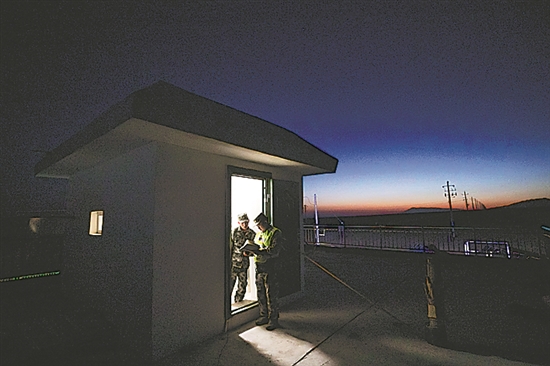 8月28日晚,兩名護邊員正在交流工作。