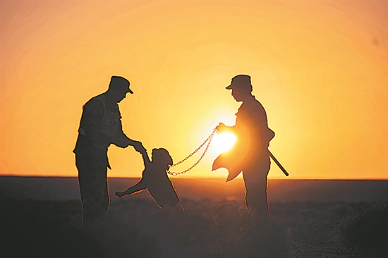 8月29日,護邊員在晨光下訓練護邊犬。