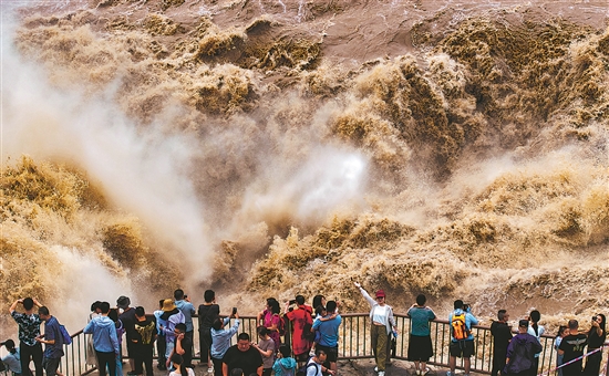 8月19日,陜西省宜川縣黃河壺口瀑布迎來瀑布群全景模式,游人在黃河壺口拍照留念。本報通訊員 趙嘵罡 攝