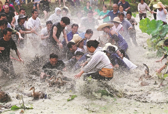 8月27日,在貴州省從江縣洛香鎮四聯侗寨,一場荷塘搶鴨摸魚活動正在舉行,吸引了眾多游客前來體驗。本報通訊員 梁輝波 攝