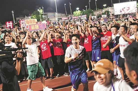 8月24日,在貴州省榕江縣,巴黎奧運會跳水男子雙人3米板冠軍龍道一在村超球場演唱自創歌曲《場壩街的崽》。本報通訊員 王炳真 攝