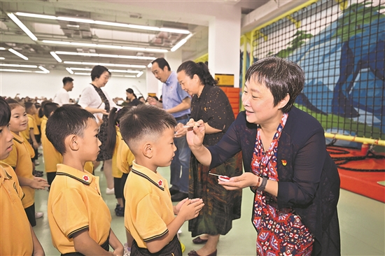 8月31日,北京第二實(shí)驗(yàn)小學(xué)校長蘆詠莉(右一)在開筆禮上為學(xué)生朱砂啟智。