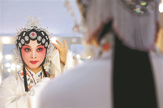 8月27日,2024首屆中國戲曲稀有劇種優秀劇目展演在山東省濱州市博興縣拉開帷幕。從8月27日至9月1日,來自全國各地41個稀有劇種的41個優秀劇目在此輪番登場,通過以折子戲、戲曲小戲、經典選段為呈現形式,集中展示戲劇藝術創作和人才培養的優秀成果,助力稀有劇種健康發展。圖為戲曲演員正在后臺整理妝容,準備登臺表演。