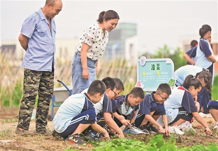 當(dāng)日,位于天津市西青區(qū)精武鎮(zhèn)的天津師范大學(xué)第三附屬小學(xué)組織學(xué)生在校勞動種植基地,開展認(rèn)識農(nóng)作物的開學(xué)第一課。