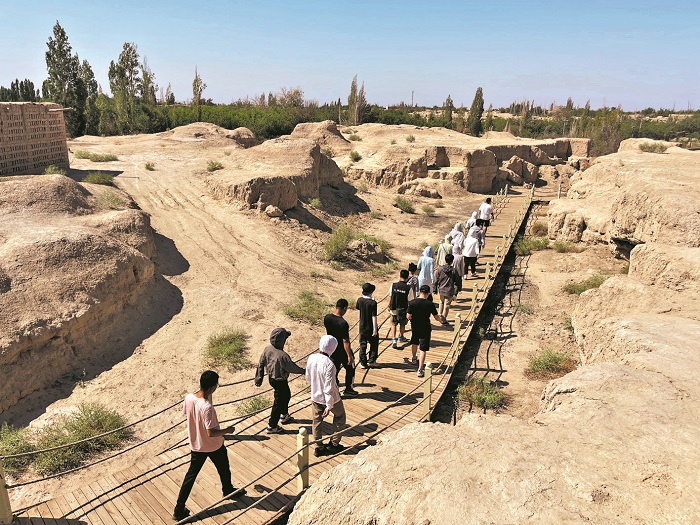 近日,新疆維吾爾自治區哈密市,游人正在拉甫卻克古城遺址游覽。