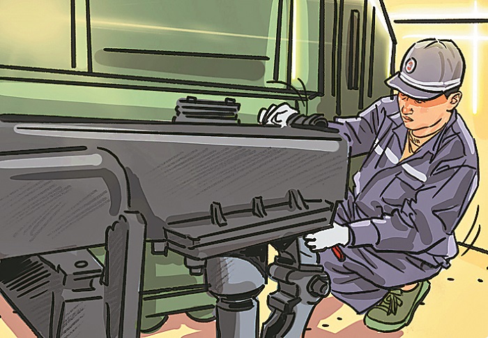 “這根簧有問題。”敲到一半時,程珂聽出異響,拿手電筒仔細觀察,發(fā)現(xiàn)緩沖器外環(huán)彈簧上有一條極其細微的裂紋,他立馬做上更換標記。從業(yè)10年,程珂已練就一雙“火眼金睛”,檢查發(fā)現(xiàn)和處理近百個車輛隱患故障。