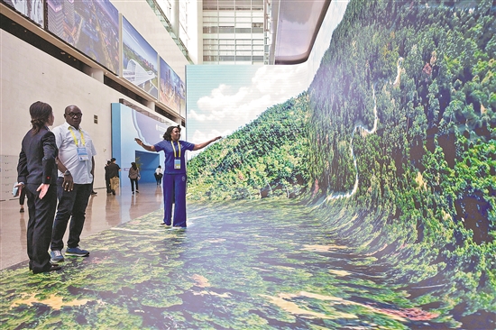 9月3日,兩名非洲記者在2024年中非合作論壇峰會新聞中心參觀超高清沉浸式體驗項目。