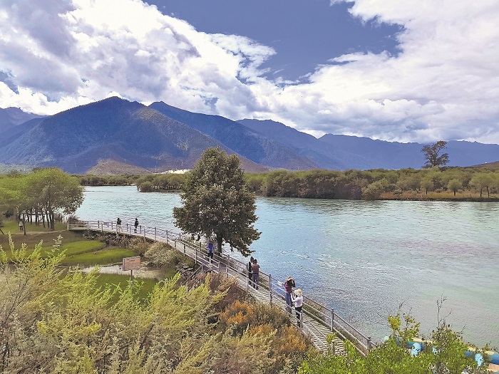 9月2日,游客行走在西藏自治區林芝市巴宜區的雅尼國家濕地公園。公園盡顯高原生態之美,水光瀲滟、草木蔥蘢,構成了一幅和諧自然、生機勃勃的生態畫卷。