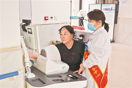 9月4日,一名居民(左)在烏海市海南區拉僧仲社區衛生服務中心測量血壓。